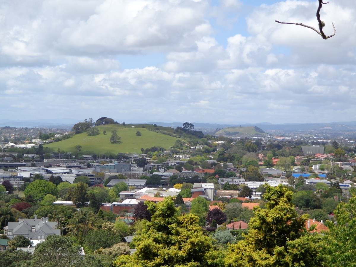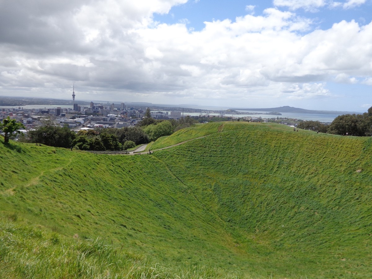 Der Turm oben rechts ist übrigen auch zu besichtigen und außen herum an einem Seil zu umrunden, wir haben dankend abgelehnt! Das Bild mitte rechts ist der Vulkan Mt. Eden. Auckland ist auf 70 Vulkanen erbaut worden und dies ist einer der Krater.