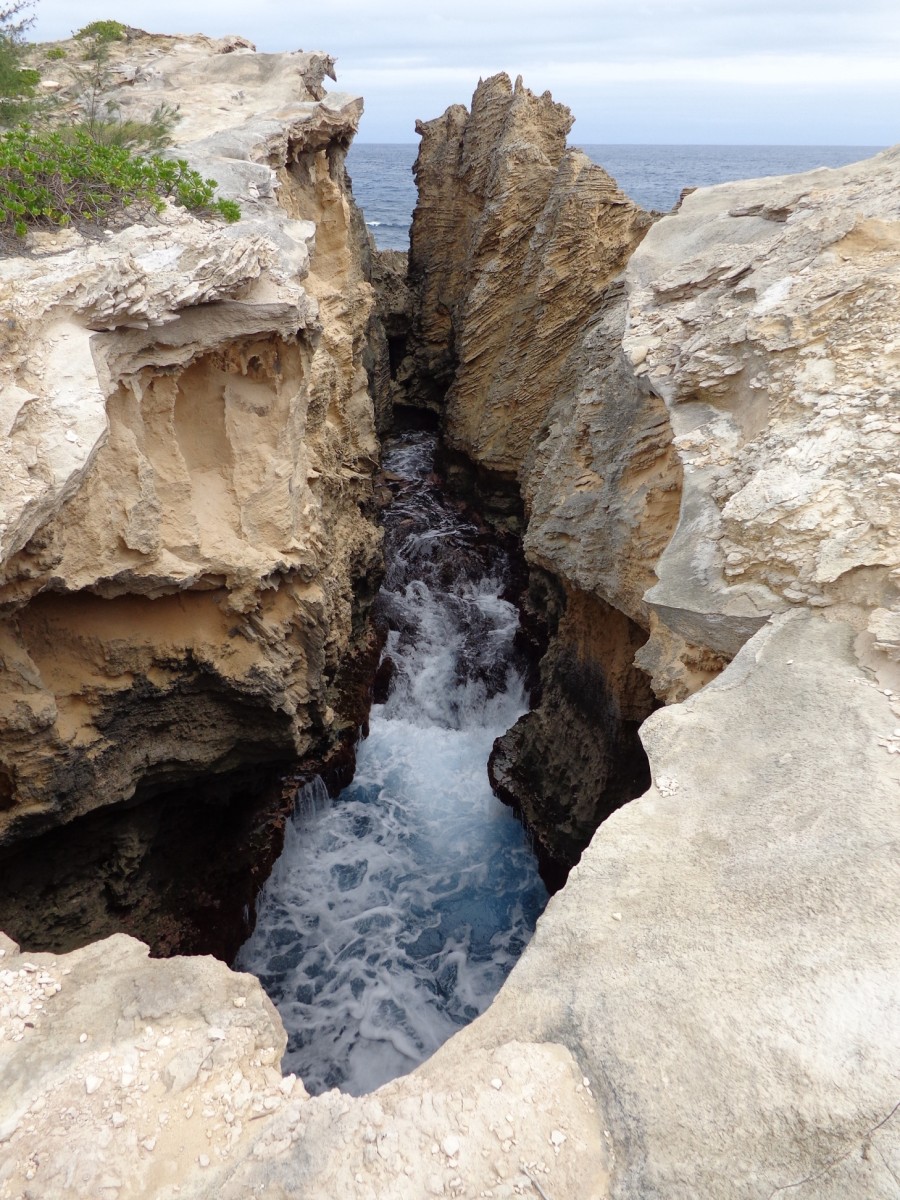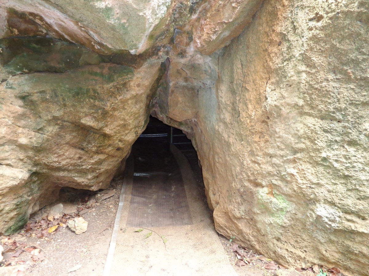 Zufällig haben wir dieses Loch, links unten, entdeckt, dass uns zu einer Art Freilufthöhle, recht oben, führte. Ja, ihr ahnt es schon, der Kniefall war angesagt! Eleganz pur, vorallem mit Rucksack.